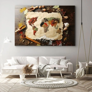 Obraz na płótnie - Mapa świata wykonana z przypraw na drewnianym tle - 70x100cm - Wszystkie smaki świata - Nowoczesna dekoracja ścienna do salonu i sypialni ARTTOR