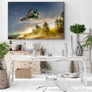 Obraz na płótnie - Motocyklista w powietrzu wykonujący akrobatyczny skok - 50x70cm - Włącz emocje! - Nowoczesna dekoracja ścienna do salonu, kuchni i sypialni ARTTOR