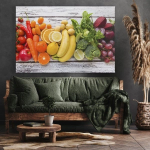 Obraz na płótnie - Kolorowe owoce i warzywa na drewnianym tle - 70x100cm - To nie wystarczy? - Nowoczesna dekoracja ścienna do salonu i sypialni ARTTOR
