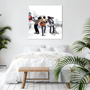Obraz na płótnie - Uliczni muzycy grający na tle miejskiego krajobrazu - 80x120cm - Muzyka ulicy - Nowoczesna dekoracja ścienna do salonu i sypialni ARTTOR