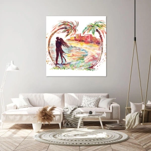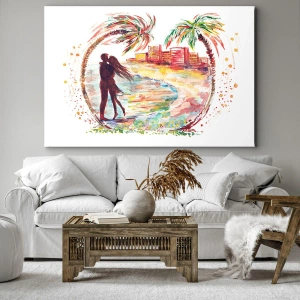 Obraz na płótnie - Para kochanków pod palmą na plaży, malowana akwarelą w ciepłych odcieniach - 50x70cm - Romantyczne wakacje - Nowoczesna dekoracja ścienna do salonu, kuchni i sypialni ARTTOR