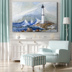 Obraz na płótnie - Latarnia morska na tle wzburzonego morza, malowana akwarelą w odcieniach niebieskiego, białego i beżowego - 50x70cm - Przeciwko ciemności i nawałnicy - Nowoczesna dekoracja ścienna do salonu, kuchni i sypialni ARTTOR