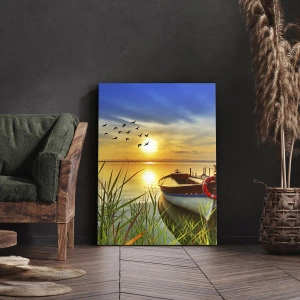 Obraz na płótnie - Łódka przy brzegu jeziora o zachodzie słońca - 70x100cm - Kormorany odlatują już - Nowoczesna dekoracja ścienna do salonu i sypialni ARTTOR