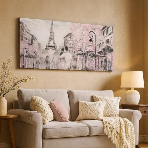 Obraz na płótnie - Wieża Eiffla z romantycznym spacerem w pastelowych tonacjach - 50x70cm - Jak zakochac się, to tylko w… - Nowoczesna dekoracja ścienna do salonu, kuchni i sypialni ARTTOR