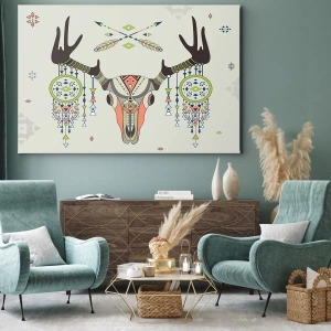 Obraz na płótnie - Boho dekoracja z czaszką jelenia i łapaczami snów - 70x100cm - Trofeum indiańskiego łowcy - Nowoczesna dekoracja ścienna do salonu i sypialni ARTTOR