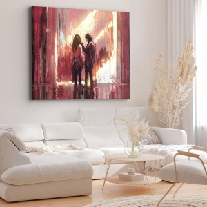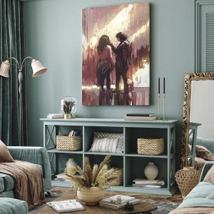 Obraz na płótnie - Para trzymająca się za ręce w świetle abstrakcyjnych barw - 50x70cm - Odwieczny spektakl miłości - Nowoczesna dekoracja ścienna do salonu, kuchni i sypialni ARTTOR
