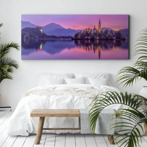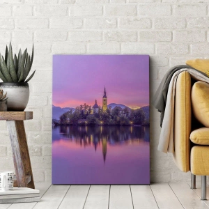 Obraz na płótnie - Malowniczy kościół na wyspie o zachodzie słońca - 50x70cm - Bajkowa wyspa o zmierzchu - Nowoczesna dekoracja ścienna do salonu, kuchni i sypialni ARTTOR