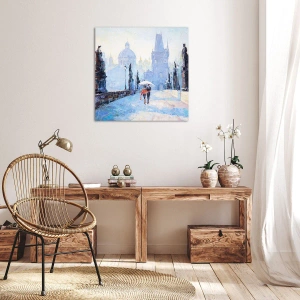 Obraz na płótnie - Romantyczna para na moście w deszczu, malarska scena - 70x100cm - Nas zaczarować musiał deszcz - Nowoczesna dekoracja ścienna do salonu i sypialni ARTTOR