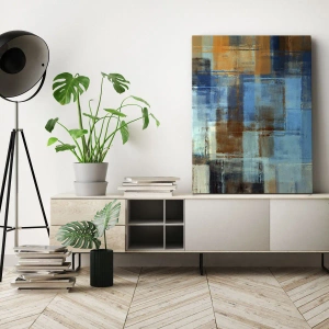 Obraz na płótnie - Abstrakcyjna kompozycja w odcieniach niebieskiego i pomarańczowego - 50x70cm - Przez błękitną zasłonę - Nowoczesna dekoracja ścienna do salonu, kuchni i sypialni ARTTOR
