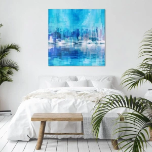 Obraz na płótnie - Abstrakcyjny krajobraz miejski w odcieniach błękitu - 50x70cm - Zatopione w błękicie - Nowoczesna dekoracja ścienna do salonu, kuchni i sypialni ARTTOR