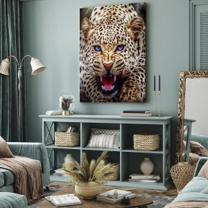 Obraz na płótnie - Groźny leopard z intensywnie błękitnymi oczami - 70x100cm - Złość piękności nie szkodzi - Nowoczesna dekoracja ścienna do salonu i sypialni ARTTOR