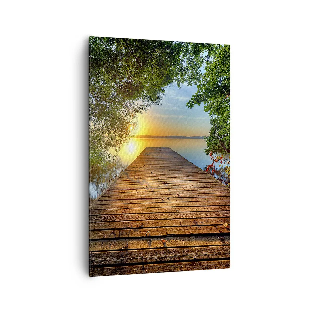 Obraz na płótnie - Drewniany pomost otoczony zielenią podczas zachodu słońca - 80x120cm - Nie śpiesz się, usiądź - Nowoczesna dekoracja ścienna do salonu i sypialni ARTTOR