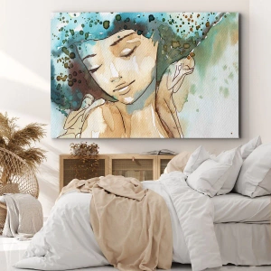 Obraz na płótnie - Subtelny portret kobiety w akwarelowych odcieniach - 50x70cm - Lady in blue - Nowoczesna dekoracja ścienna do salonu, kuchni i sypialni ARTTOR