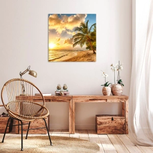 Obraz na płótnie - Plaża z palmami i zachodem słońca nad oceanem - 80x120cm - Wieczne lato, zawsze wakacje - Nowoczesna dekoracja ścienna do salonu i sypialni ARTTOR