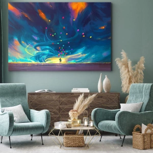 Obraz na płótnie - Fantastyczna scena z unoszącymi się balonami na tle nieba - 50x70cm - Na niebieski wiatr - Nowoczesna dekoracja ścienna do salonu, kuchni i sypialni ARTTOR