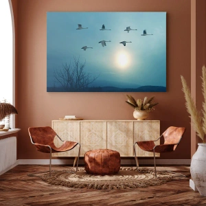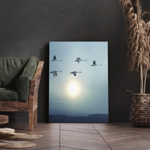 Obraz na płótnie - Stado lecących łabędzi na tle słońca i mglistych gór - 50x70cm - Żegnaj lato na rok - Nowoczesna dekoracja ścienna do salonu, kuchni i sypialni ARTTOR