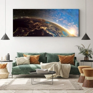 Obraz na płótnie - Widok na Ziemię z kosmosu o wschodzie słońca - 80x120cm - Spójrzmy na siebie z dystansu - Nowoczesna dekoracja ścienna do salonu i sypialni ARTTOR