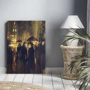Obraz na płótnie - Postacie z parasolami w deszczowym mieście nocą - 80x120cm - Wyznawcy deszczu - Nowoczesna dekoracja ścienna do salonu i sypialni ARTTOR