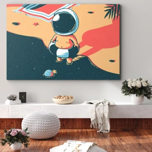Obraz na płótnie - Zabawny astronauta na plaży z kosmicznymi elementami w tle - 80x120cm - Z innej perspektywy - Nowoczesna dekoracja ścienna do salonu i sypialni ARTTOR