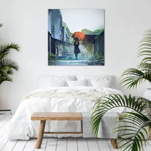 Obraz na płótnie - Postać z parasolem w deszczowym mieście - 80x120cm - Ożywczy deszcz - Nowoczesna dekoracja ścienna do salonu i sypialni ARTTOR