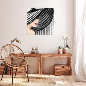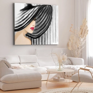 Obraz na płótnie - Kobieta w kapeluszu w czarno-białym stylu z czerwonym akcentem - 80x120cm - Gdzie ciebie szukać? - Nowoczesna dekoracja ścienna do salonu i sypialni ARTTOR