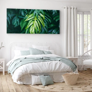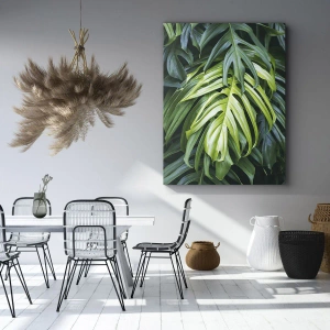 Obraz na płótnie - Zielone liście w gęstym tropikalnym układzie - 80x120cm - Zanurzyć się w świeżości - Nowoczesna dekoracja ścienna do salonu i sypialni ARTTOR