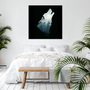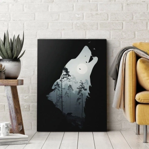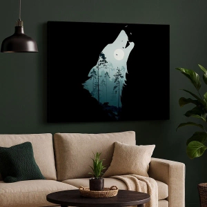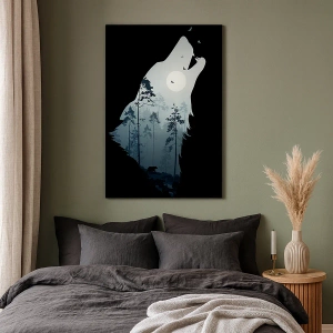 Obraz na płótnie - Silhouette wilka z lasem i księżycem w tle - 70x100cm - Głos leśnej nocy - Nowoczesna dekoracja ścienna do salonu i sypialni ARTTOR