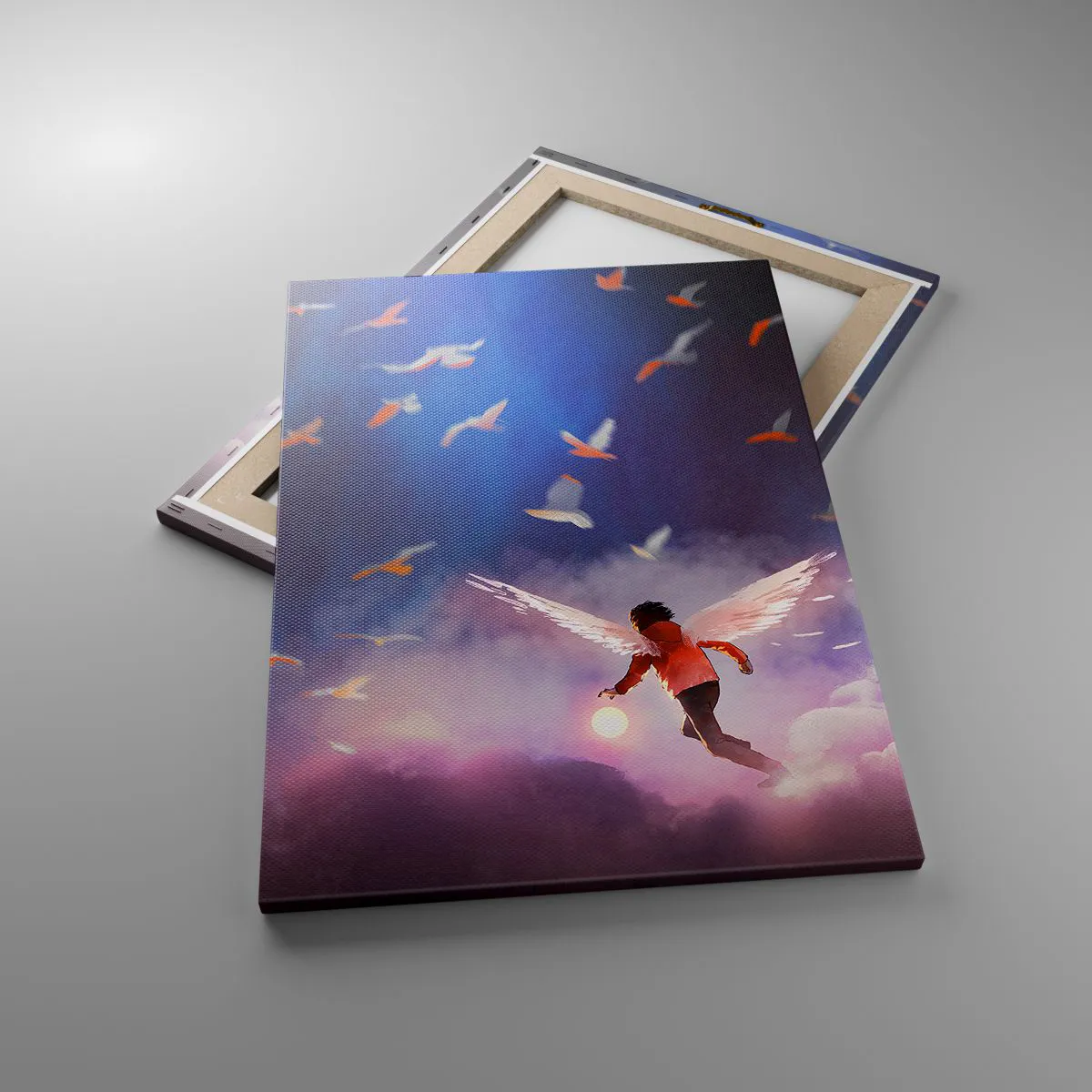 Obraz na płótnie - Postać ze skrzydłami unosząca się wśród chmur i ptaków na tle błękitnego nieba - 50x70cm - Trzeba mieć wyobraźnię i odwagę - Nowoczesna dekoracja ścienna do salonu, kuchni i sypialni ARTTOR