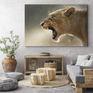 Obraz na płótnie - Dynamiczna fotografia ryczącej lwicy ukazanej w złotym świetle z unoszącymi się drobinami kurzu - 50x70cm - Spróbuj nie posłuchać - Nowoczesna dekoracja ścienna do salonu, kuchni i sypialni ARTTOR