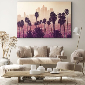 Obraz na płótnie - Palmy na tle miasta o zachodzie słońca - 50x70cm - Kalifornijski pejzaż - Nowoczesna dekoracja ścienna do salonu, kuchni i sypialni ARTTOR