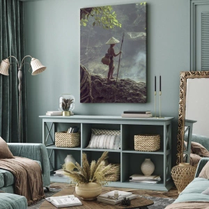 Obraz na płótnie - Chłopiec w tradycyjnym kapeluszu bambusowym stojący na skale z dzidą i koszem na tle lasu - 50x70cm - Zaprzyjaźniony z naturą - Nowoczesna dekoracja ścienna do salonu, kuchni i sypialni ARTTOR