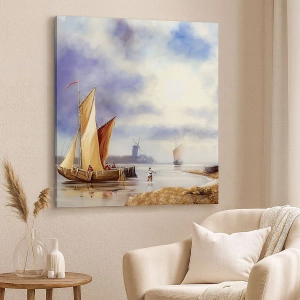 Obraz na płótnie - Obraz przedstawia żaglowiec na spokojnej wodzie z wiatrakiem w tle - 50x70cm - Powrót żeglarzy - Nowoczesna dekoracja ścienna do salonu, kuchni i sypialni ARTTOR