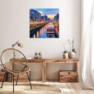 Obraz na płótnie - Wieczorny widok kanału z łodzią i światełkami - 50x70cm - Wieczór światła i zabawy - Nowoczesna dekoracja ścienna do salonu, kuchni i sypialni ARTTOR