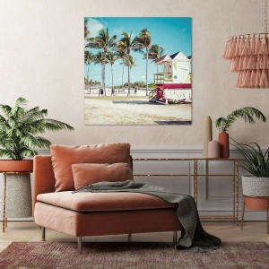Obraz na płótnie - Kolorowa wieża ratownicza na plaży z palmami - 50x70cm - Przed tobą piękny dzień - Nowoczesna dekoracja ścienna do salonu, kuchni i sypialni ARTTOR