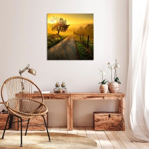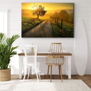 Obraz na płótnie - Malownicza droga o zachodzie słońca z samotnym drzewem na tle - 140x50cm - Miodne popołudnie - Nowoczesna dekoracja ścienna do salonu i sypialni ARTTOR