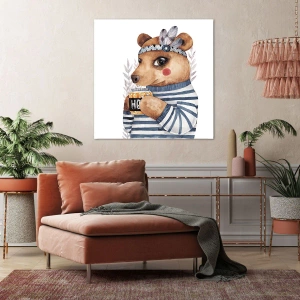 Obraz na płótnie - Ilustracja misia w paskowanym swetrze, z kubkiem w dłoni i piórkami na opasce - 50x70cm - Słodka Misia - Nowoczesna dekoracja ścienna do salonu, kuchni i sypialni ARTTOR