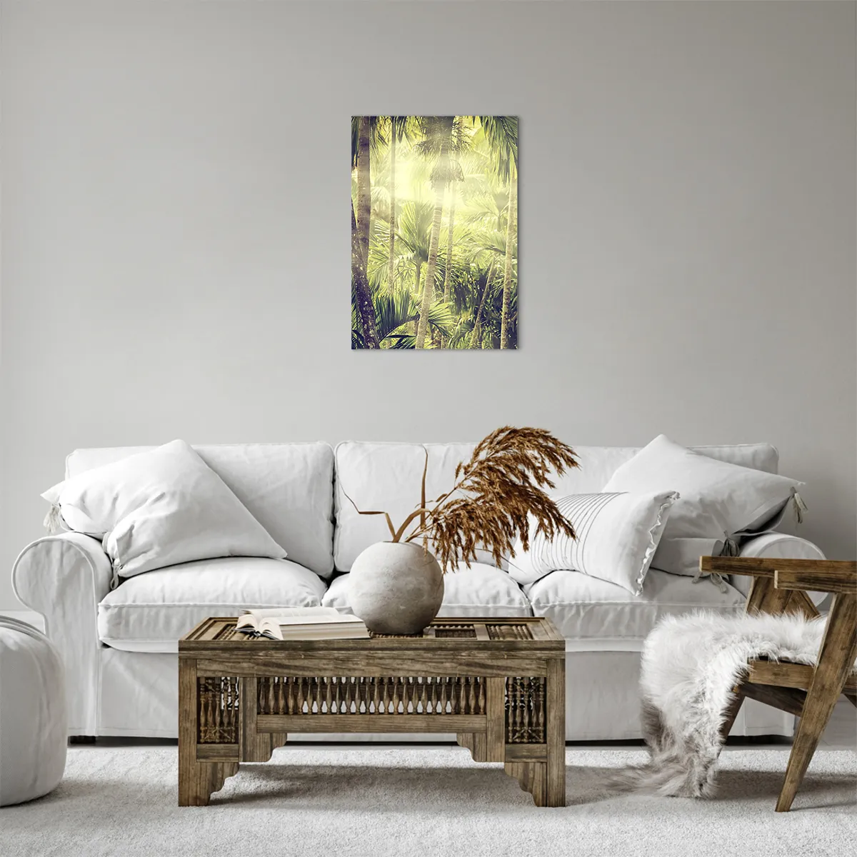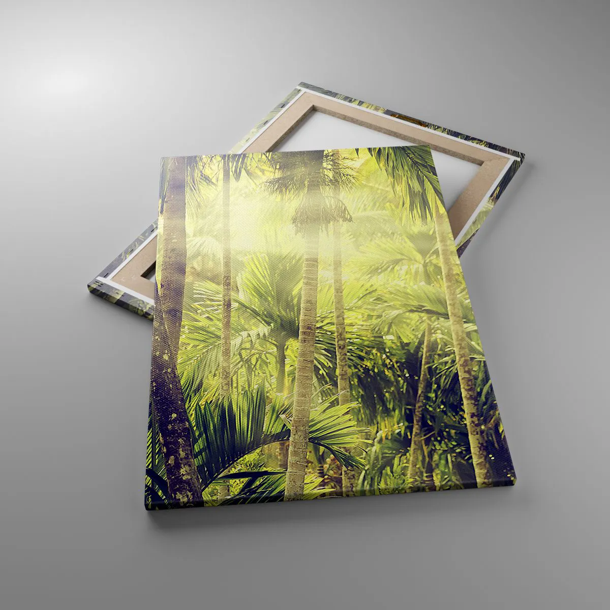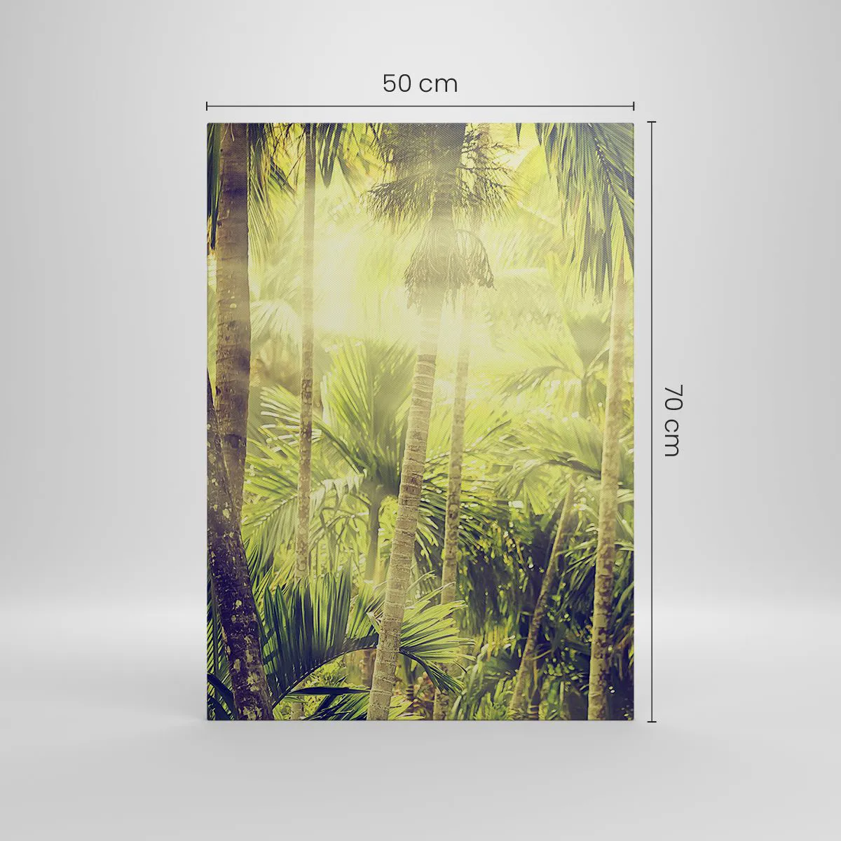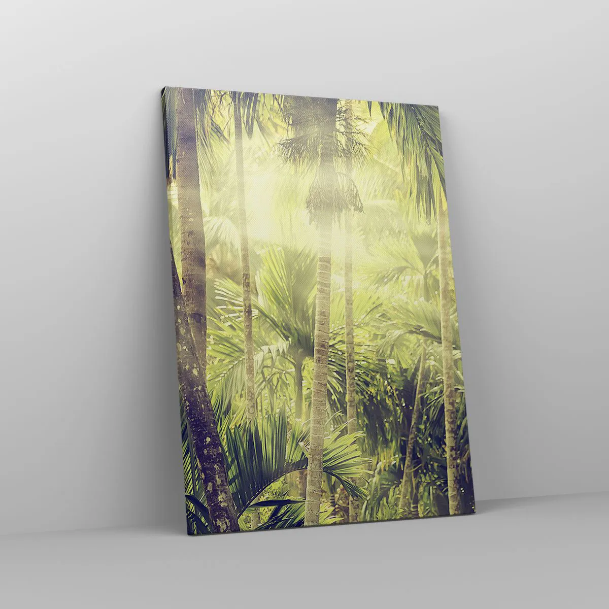Obraz na płótnie - Tropikalny las palmowy w promieniach słońca - 50x70cm - W zielonym żarze - Nowoczesna dekoracja ścienna do salonu, kuchni i sypialni ARTTOR
