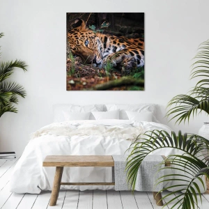 Obraz na płótnie - Leżący lampart z intensywnie niebieskimi oczami w lesie - 50x70cm - Zaufaj mi - Nowoczesna dekoracja ścienna do salonu, kuchni i sypialni ARTTOR