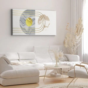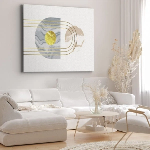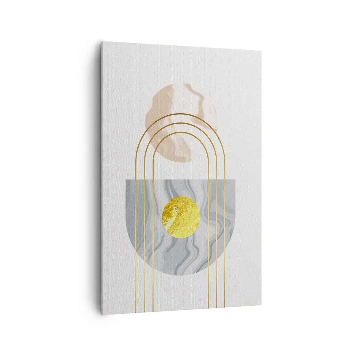 Obraz na płótnie - Abstrakcyjna kompozycja z okręgami i złotymi liniami na jasnym tle - 80x120cm - Jasność i blask - Nowoczesna dekoracja ścienna do salonu i sypialni ARTTOR