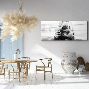 Obraz na płótnie - Kobieta z aparatem w artystycznej, podwójnej ekspozycji - 50x70cm - Twórca i tworzywo - Nowoczesna dekoracja ścienna do salonu, kuchni i sypialni ARTTOR