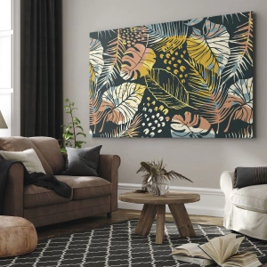 Obraz na płótnie - Kolorowe liście tropikalne na ciemnym tle - 50x70cm - Liściasta fantazja - Nowoczesna dekoracja ścienna do salonu, kuchni i sypialni ARTTOR