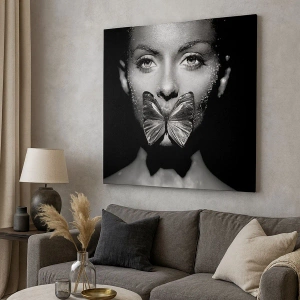 Obraz na płótnie - Czarno-biała twarz kobiety z motylem na ustach - 70x100cm - Motyli pocałunek - Nowoczesna dekoracja ścienna do salonu i sypialni ARTTOR