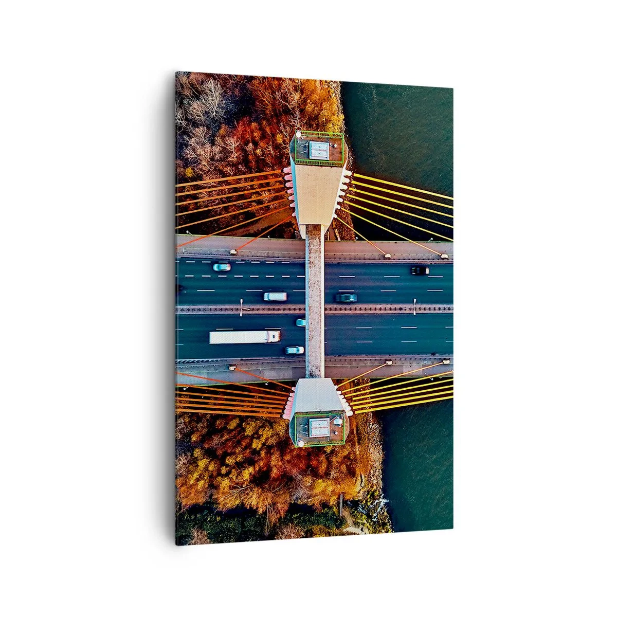 Obraz na płótnie - Most widziany z lotu ptaka nad rzeką i jesiennym krajobrazem - 80x120cm - ZA wodami, za lasami - Nowoczesna dekoracja ścienna do salonu i sypialni ARTTOR