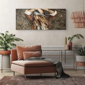 Obraz na płótnie - Kobieta w stylu boho z dredami i piórami leżąca na sianie - 50x70cm - W drodze do lata miłości - Nowoczesna dekoracja ścienna do salonu, kuchni i sypialni ARTTOR