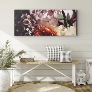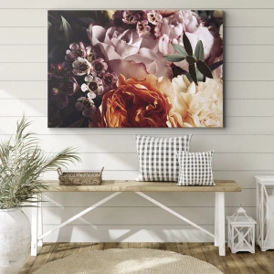 Obraz na płótnie - Bukiet kwiatów w odcieniach różu, pomarańczu i bieli - 50x70cm - Otulone pięknem - Nowoczesna dekoracja ścienna do salonu, kuchni i sypialni ARTTOR