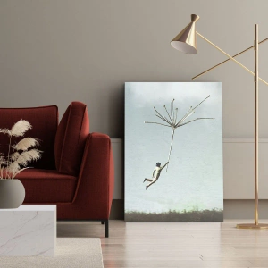 Obraz na płótnie - Osoba lecąca na nasionku dmuchawca w pastelowym niebie - 50x70cm - Latawce, dmuchawce, wiatr - Nowoczesna dekoracja ścienna do salonu, kuchni i sypialni ARTTOR