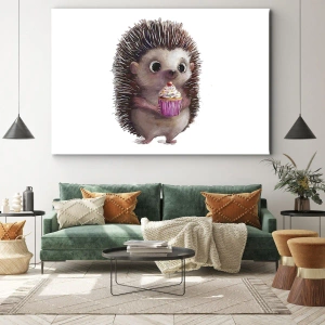 Obraz na płótnie - Uroczy jeżyk z babeczką - 80x120cm - Święto jest co dzień - Nowoczesna dekoracja ścienna do salonu i sypialni ARTTOR