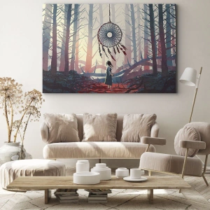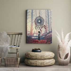 Obraz na płótnie - Leśna scena z wielkim łapaczem snów - 80x120cm - Tajemny rytuał szczęścia - Nowoczesna dekoracja ścienna do salonu i sypialni ARTTOR