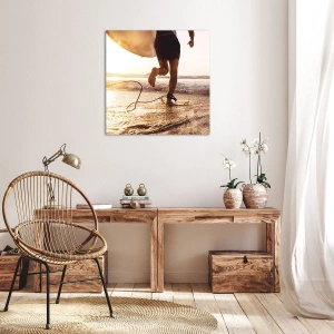 Obraz na płótnie - Surfer biegnący po plaży z deską na tle zachodu słońca - 50x70cm - Na spotkanie fali - Nowoczesna dekoracja ścienna do salonu, kuchni i sypialni ARTTOR