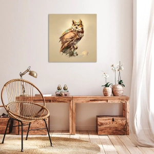 Obraz na płótnie - Artystyczny portret sowy na jasnym tle w ciepłych odcieniach - 100x70cm - Najmądrzejsza sowa - potwierdzi dąbrowa - Nowoczesna dekoracja ścienna do salonu, kuchni i sypialni ARTTOR